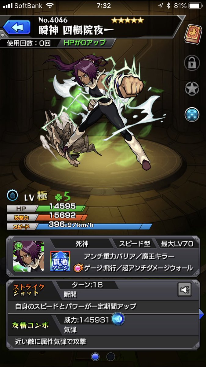夜一さまめっちゃ32階で無双なんですけど…SSでほぼゲージ1つ持って行くじゃん…艦隊余裕ですね。32階適正居ない人はBLEACHガチャで夜一2~3体確保しましょう✨