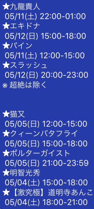 前回の九龍、パイン、エキドナの降臨スケジュールを参考にしました。