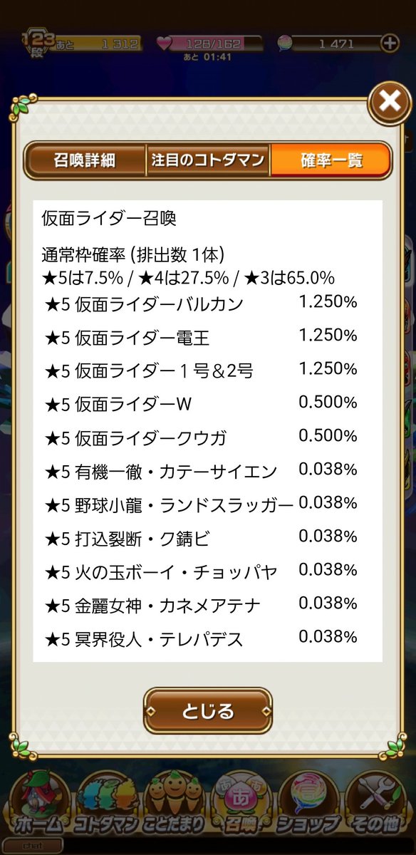 @kotodaman_pr 7.5%(星5)でライダーの確率が1%変わると