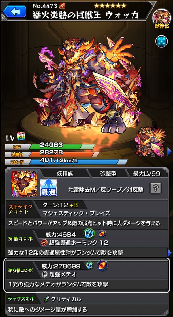 「猛火炎熱の巨獣王 ウォッカ」!ステータスが平均的に高く、砲撃型の超強貫通ホーミング12と超強メテオの友情コンボの組み合わせも強力!またカウンターキラーの効果が友情コンボで発動した際はさらに威力がUP!地雷とワープに対応出来る汎用性に、12と20ターンで使い分けできるSSも◎! #モンスト pic.twitter.com/N0IWM5aeAR