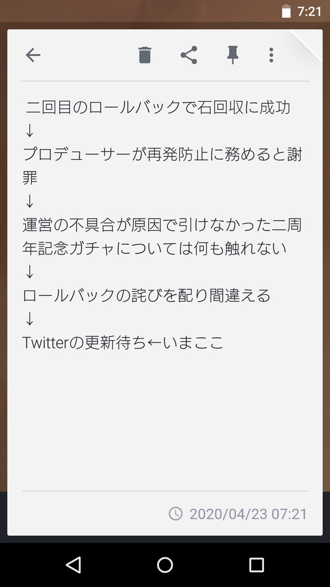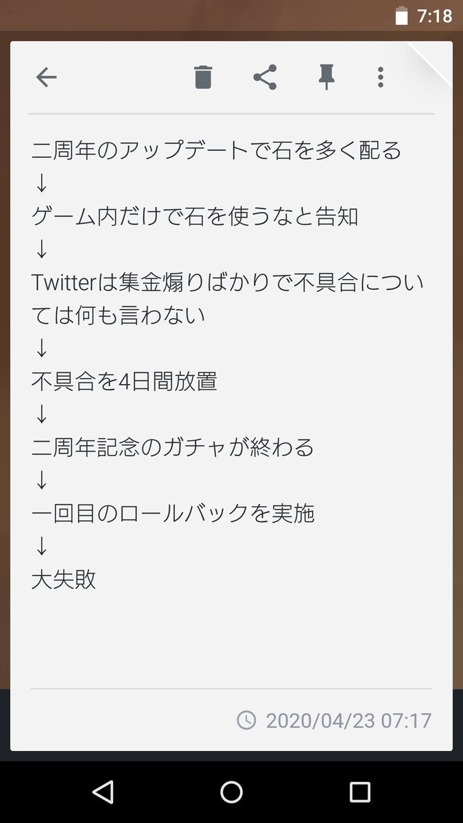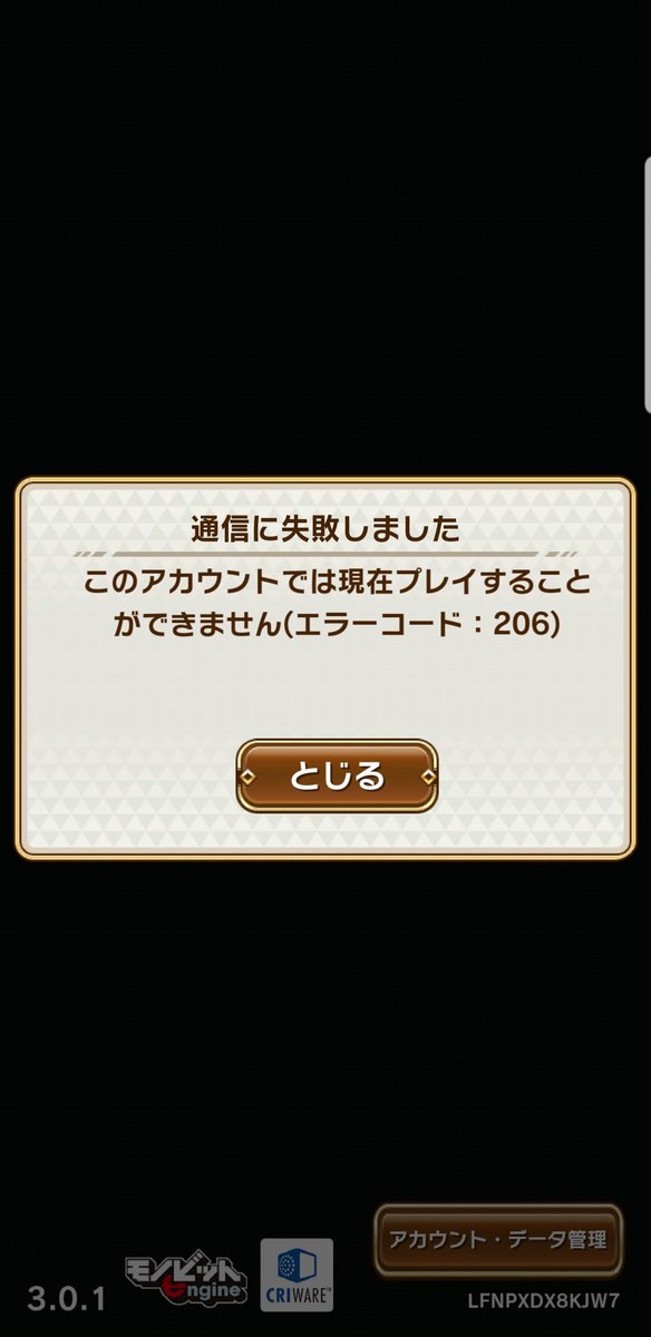 @kotodaman_pr 起動したらエラーがでて自分もこの対象になっていたのかもしれません。Twitterみてなかったのでアカウント乗っ取りか?と思ってしまいデータを消してメモしてた引き継ぎ入れても出来なかったので焦りました\(>_<)/せめてタイトル画面にポップアップでもいれて欲しかったです、、、汗